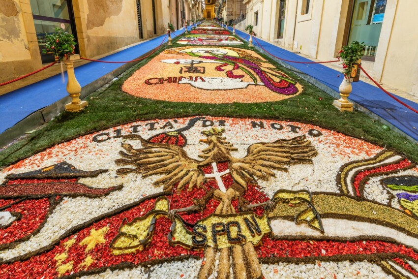 The Infiorata of Noto transforms one of the town’s streets, lined with elegant palaces and topped by the elaborate facade of the Church of Montevergini, into an open-air work of art created with flowers of different species and colours. The floral compositions created by flower artists depict religious subjects or popular themes.
