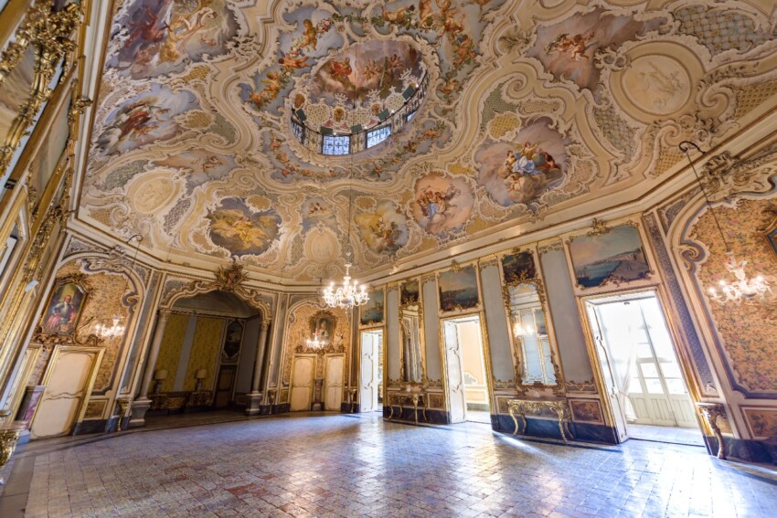 The interior features a sumptuous ballroom with a domed vault, Rococo decorations, mirrors, frescoes and a gallery with an extraordinary spiral staircase ingeniously designed to create a sense of lightness.