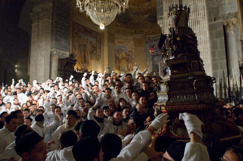 The impressive Latin cross interior, divided into three naves, houses notable artworks and contains celebrated tombs. Notable are the tomb of Vincenzo Bellini, the famous composer born in Catania, and two sarcophagi—one from the Roman period containing the remains of members of the Aragonese royal family, and the other Gothic, belonging to Costanza d’Aragona—located within the Norman chapel of the Madonna, one of the cathedral’s most precious works.
