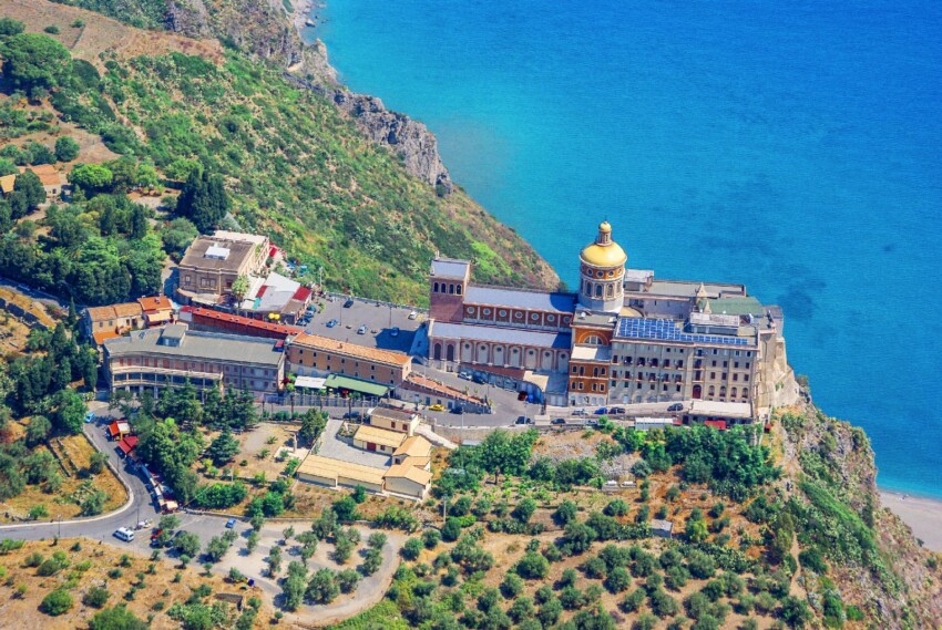 The Basilica Sanctuary of Maria Santissima stands as one of Sicily’s most important sacred sites, located at the easternmost point of the promontory where the acropolis once stood. The Sanctuary was built where a previous religious building had stood before its destruction during the Ottoman invasion, later rebuilt in the mid-sixteenth century. In 1953, the Sanctuary underwent necessary enlargement and restoration works, resulting in the current structure characterised by a Latin cross layout with three naves, a square transept and a semicircular apse.