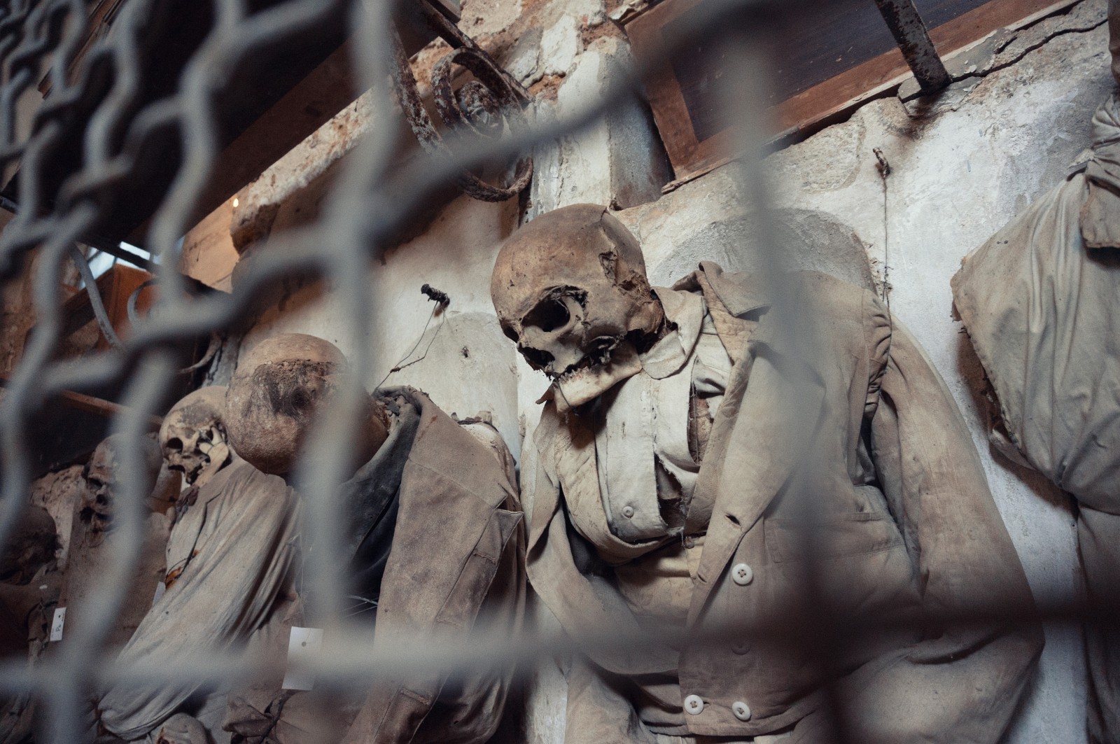 The mummies, many of which are preserved in an upright position, are displayed in white niches carved into the tufa galleries. A plaque records their name, surname and date of death.