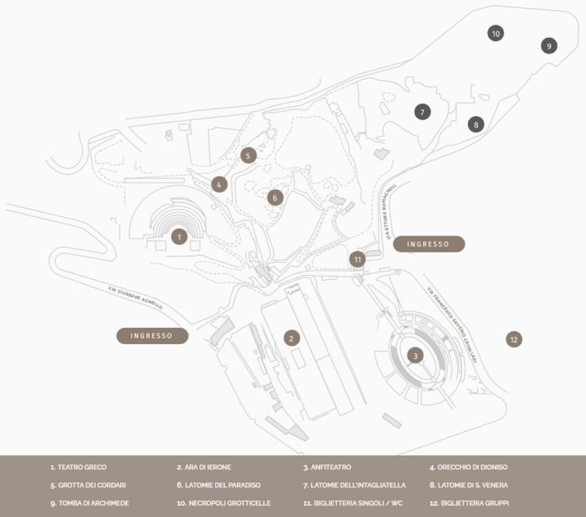 The Greek Theatre is located north-west of Ortygia island and immediately west of the Madonna of Tears Sanctuary Basilica. Access is via the gate of the Neapolis Archaeological Park, which can be easily reached from Ortygia and other parts of Syracuse by the electric shuttle bus provided by the city council, which terminates at Molo Sant’Antonio, near the entrance to Ortygia; a bus departs from here every 30 minutes. Timetables vary depending on the season, but services typically start around 9-10 in the morning and run until evening.