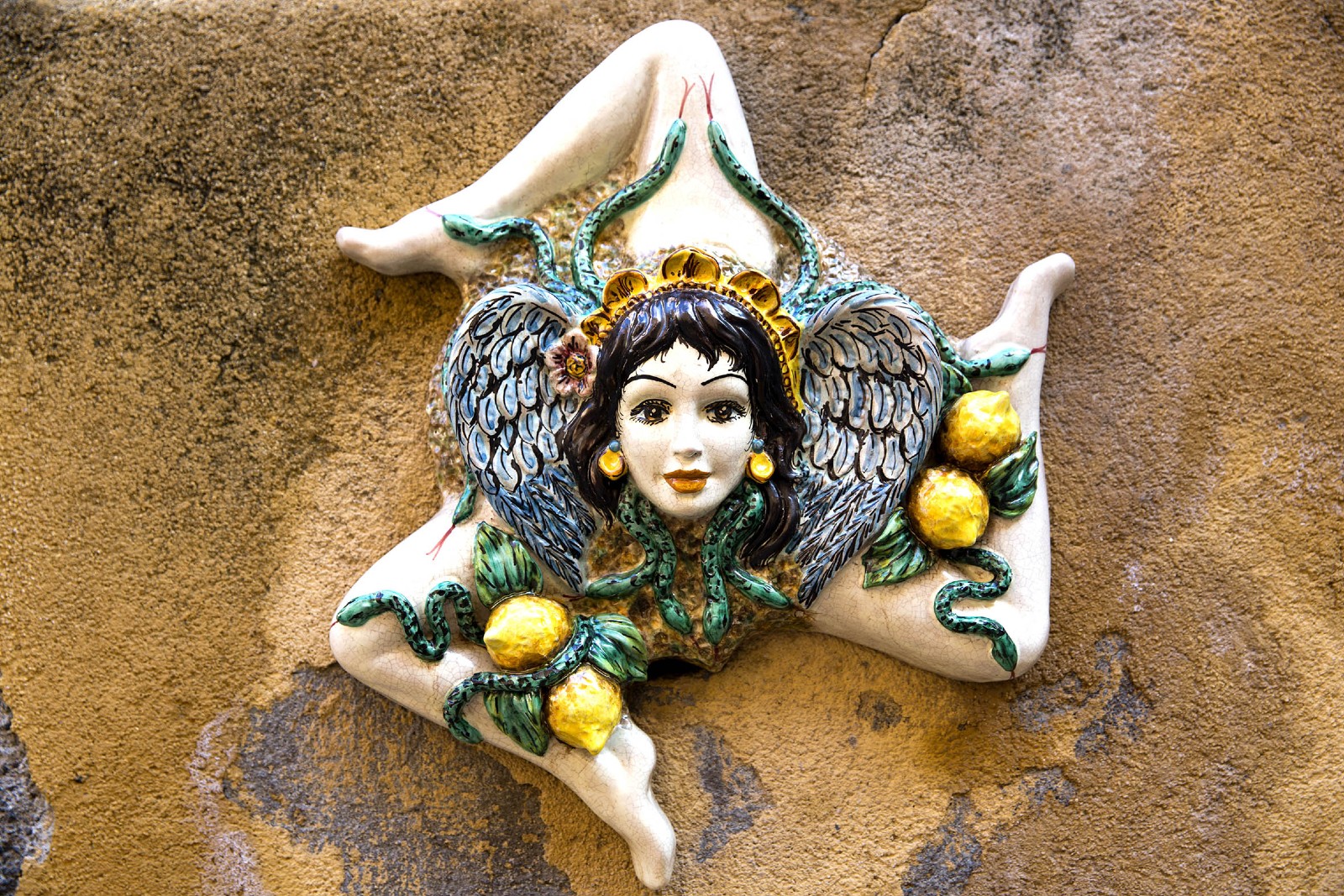 Today the trinacria is even represented in the official regional coat of arms, set against yellow and red backgrounds. The two colours represent the courage of the cities of Palermo and Corleone, which distinguished themselves during the Sicilian Vespers of 1282 by rising up against the French. Identified by Sicilians as a good luck charm and by tourists as a curious souvenir, the Sicilian trinacria also carries meanings of fertility, purification and good wishes.